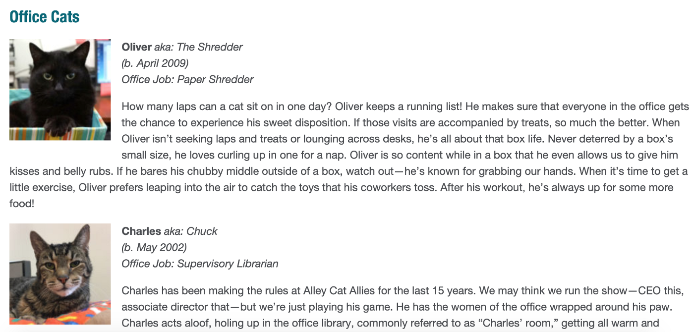 An unhappy workplace: On Glassdoor, Alley Cat Allies has more than a dozen anonymous, harshly negative reviews, assailing Robinson’s leadership and the board’s inaction. Only 19 percent of the employees would recommend working there, and just 23 percent approve of the CEO. When workers can’t stand the boss, an organization cannot function at peak effectiveness.