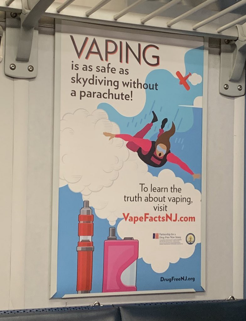 Take a look, please, at this poster from the Partnership for a Drug Free New Jersey, a nonprofit supported by tax dollars. Setting aside the absurd notion of a drug-free New Jersey — presumably, there are no plans to ban alcohol, caffeine and aspirin from the Garden State — the clear implication is that e-cigarettes will kill everyone who tries them. This is so patently false that it is unlikely to deter anyone from vaping. It is, however, an extreme example of how unscientific, distorted and one-sided the debate about vaping has become in the US.